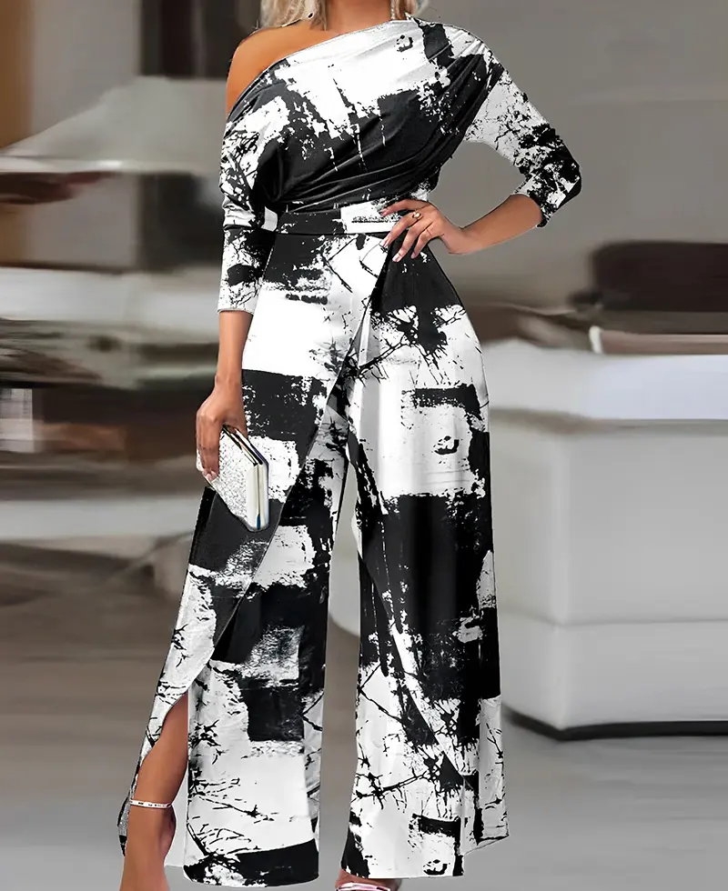 Tie Dye Print Skew Neck Wrapped Slit Wide Leg Jumpsuit